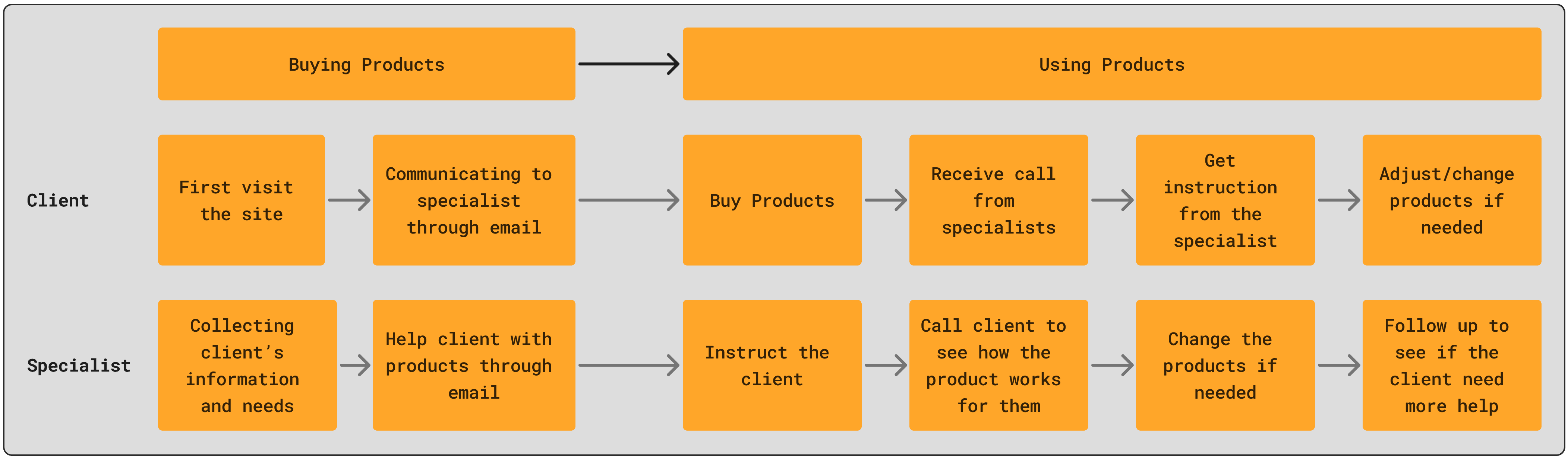 I mapped out the buying process of client and consultation process of specialist to better understand the user journey.